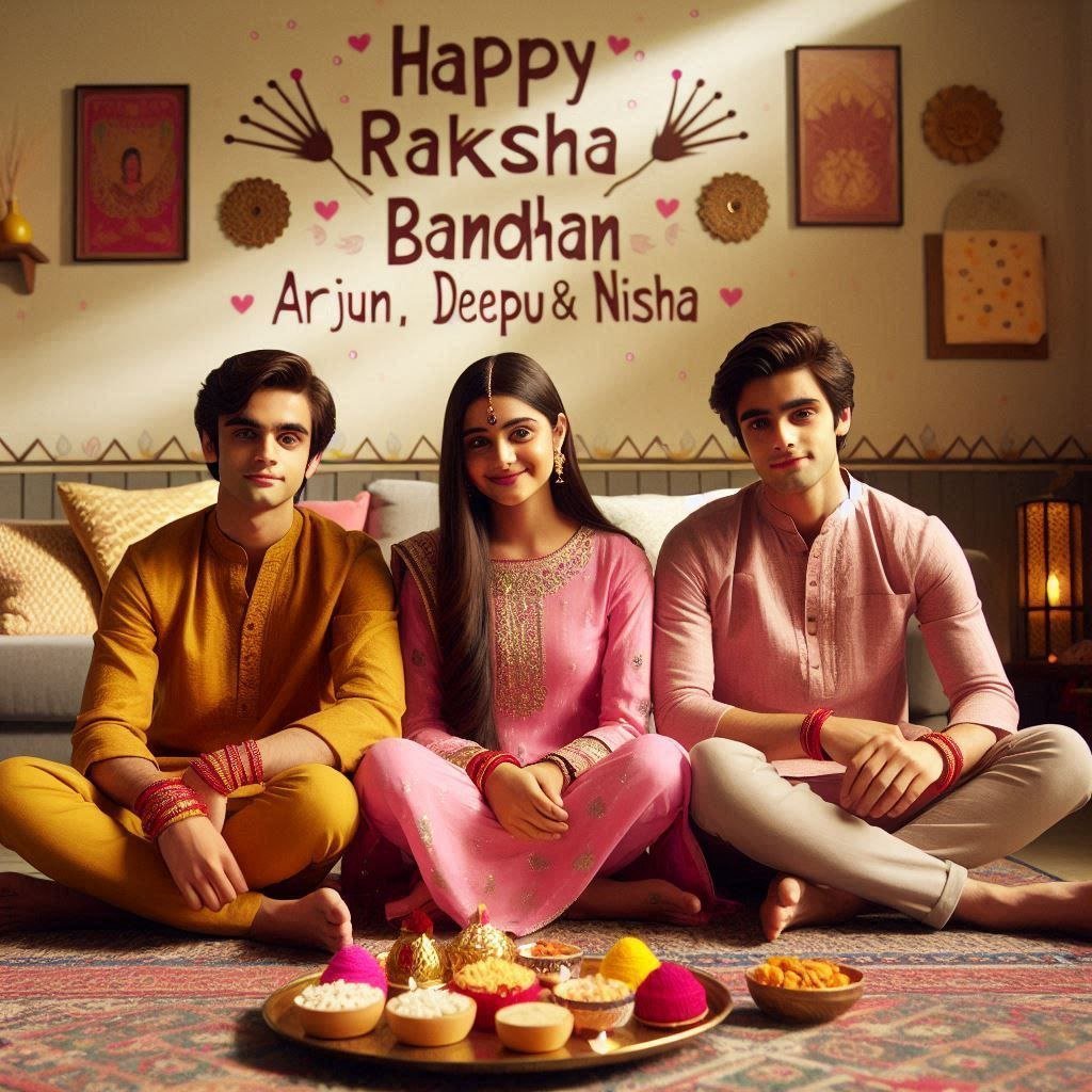 Two young boys, ages 16 and 18 are celebrating Raksha Bandhan with their 15-year-old sister. The girl wear matching pink salwar kameez outfits, while the boys is in a yellow kurta. They're sitting cross-legged on a patterned rug in their living room. A plate with rakhis, sweets, and a small diya lamp is in front of them. On the wall behind them, "HAPPY RAKSHA BANDHAN" is painted in bold letters, with "Arjun, Deepu & Nisha" written underneath. 4k image, warm indoor.