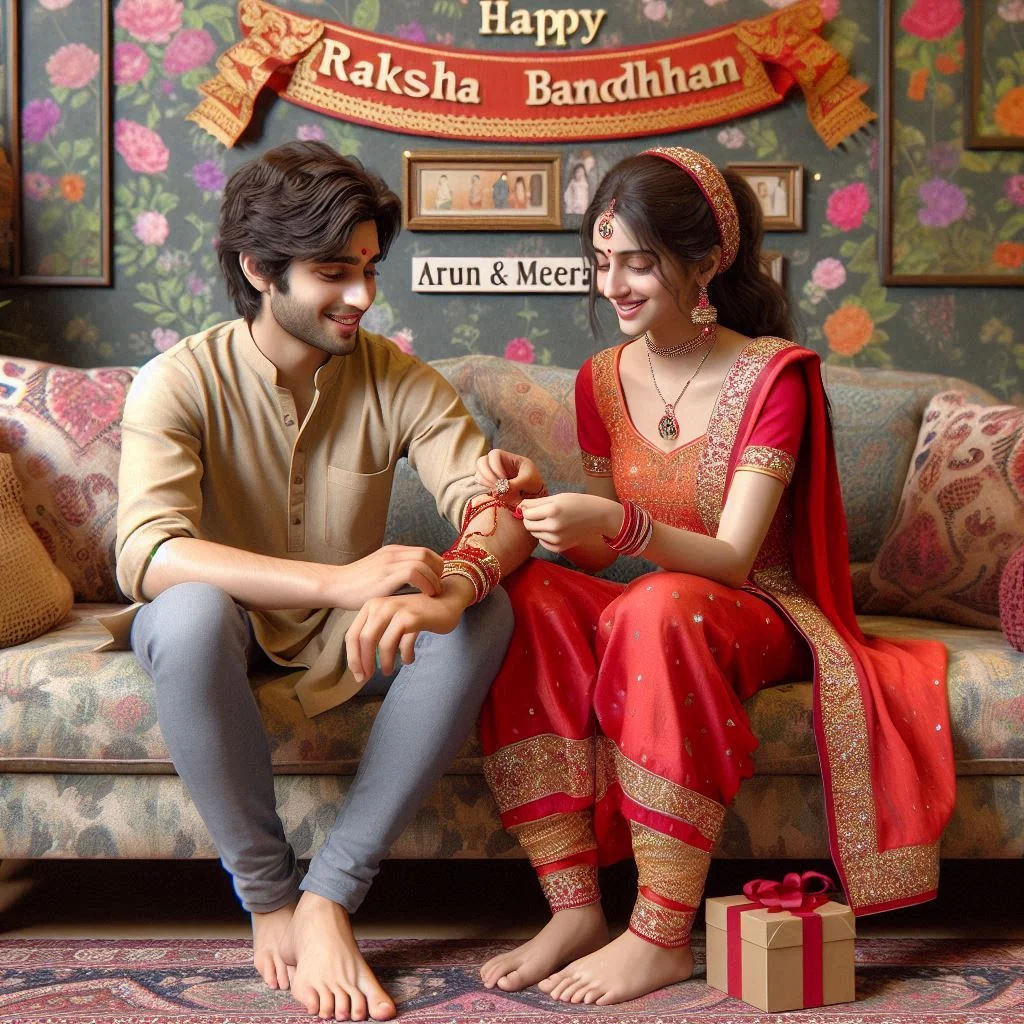 A lifelike 4K image of a 22-year-old brother and 18-year-old sister sitting on a floral patterned sofa. The sister, wearing a bright red salwar kameez, is tying a glittering rakhi on her brother's wrist. The brother, in a beige kurta, holds a small gift bag. Both are smiling warmly. A colorful "Happy Raksha Bandhan" banner hangs on the wall behind them, with "Arun & Meera" written below in decorative script.