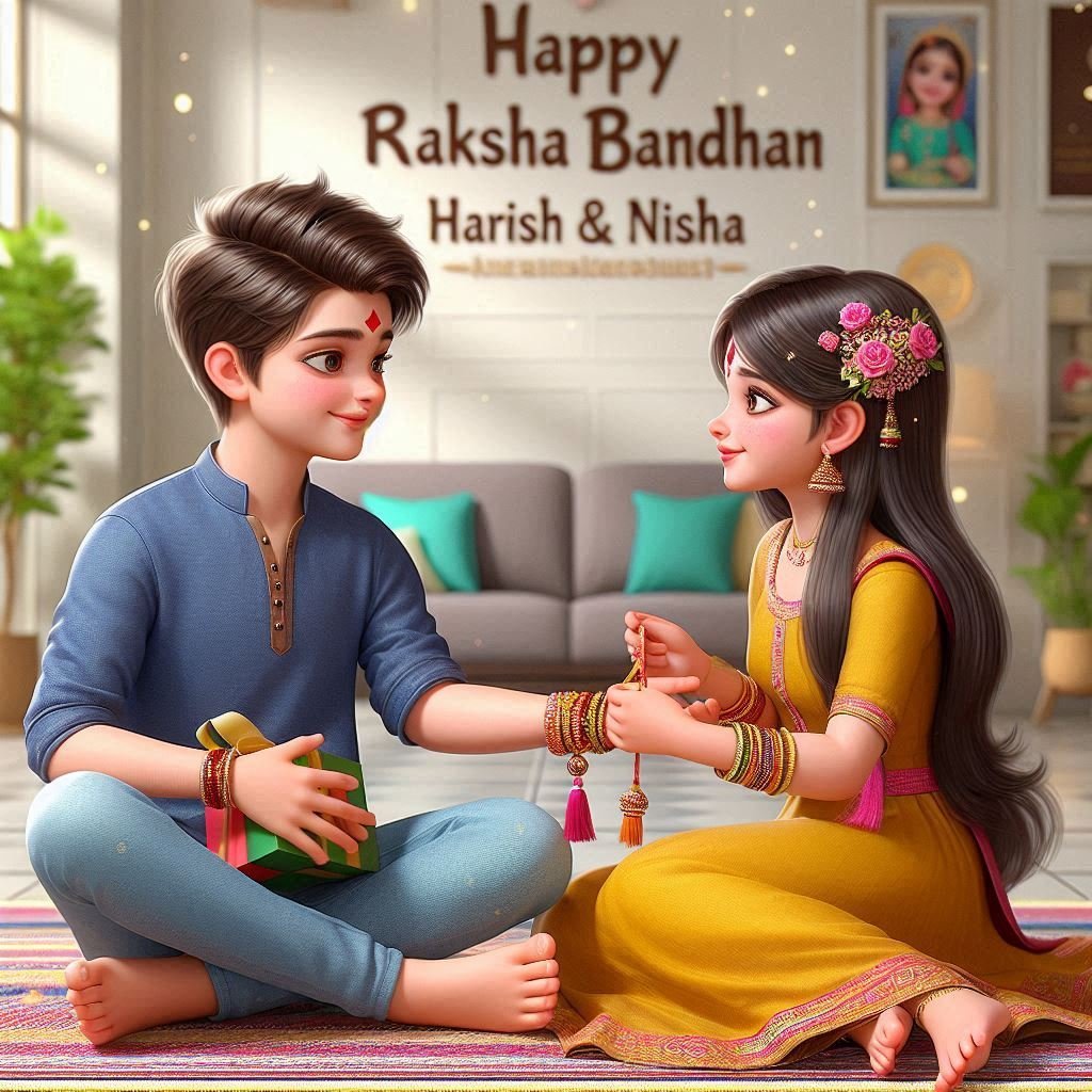 A realistic 20 year old Cute boy and girl are sitting face to face on a colorful mat in the home lobby, the boy has extended one of his hand forward And Girl tying Rakhi on brother's hand. boy is wearing a Blue colored kurta And the girl is wearing a yellow Lahenga, boy has a gift box in his other hand, is smiling, girl has applied tilak on his forehead, and on the wall in bold letters "HAPPY RAKSHA BANDHAN" "Harish & Nisha" It is written, 4k image