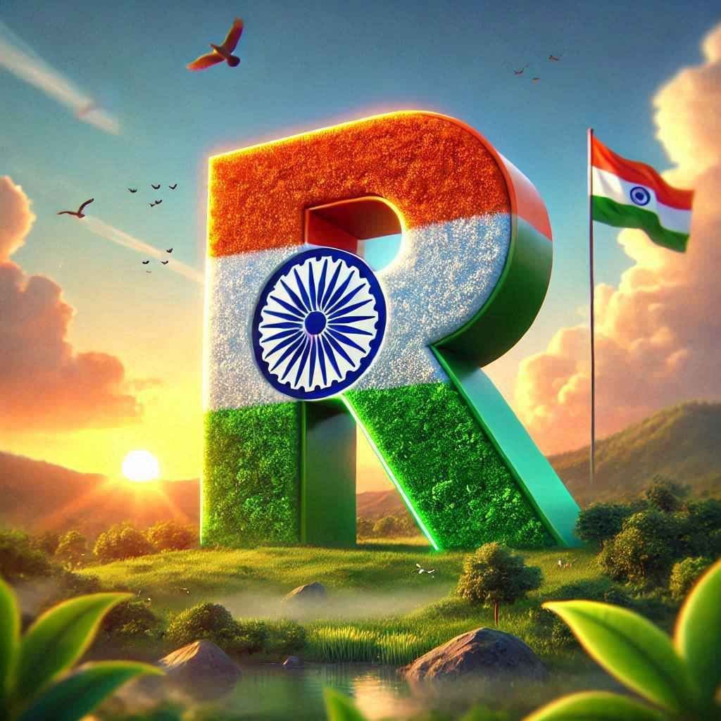 Create a vibrant and colorful 3D-rendered scene featuring the letter 'R' designed in the style of the Indian flag. The top of the 'R' should have saffron, the middle white with the Ashoka Chakra in blue, and the bottom green. Place the letter in a picturesque landscape during sunrise or sunset, with lush greenery, mountains, and a serene sky in the background. Include the Indian national flag on a pole to the right of the 'R' and birds flying in the sky for added depth.