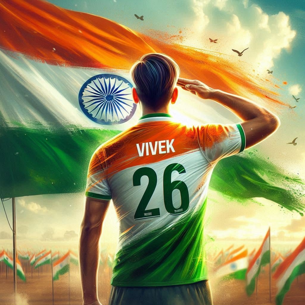 An artistic digital painting of a person saluting the Indian national flag during Republic Day celebrations. The person is wearing a tricolor jersey with the name 'Vivek' and the number '26' printed on the back, representing January 26th. The jersey incorporates the Indian flag's colors: saffron, white, and green, with intricate detailing. The background features the Indian national flag waving proudly against a bright sky with soft clouds, evoking a sense of patriotism