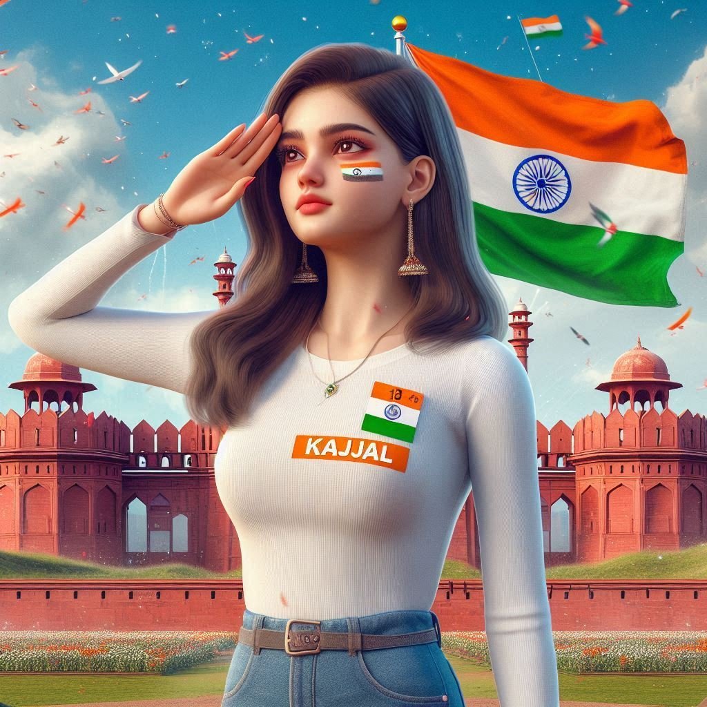 Create a 3D image of 18 year old indian beautiful girl is wearing White color shirt and saluting to indian flag and behind her red fort placed and hoisting flag on that ,written "Happy Republic Day" on the sky and "Kajal" is written on her shirt with bold letters and also in overall image has the divine background like indian republic day.