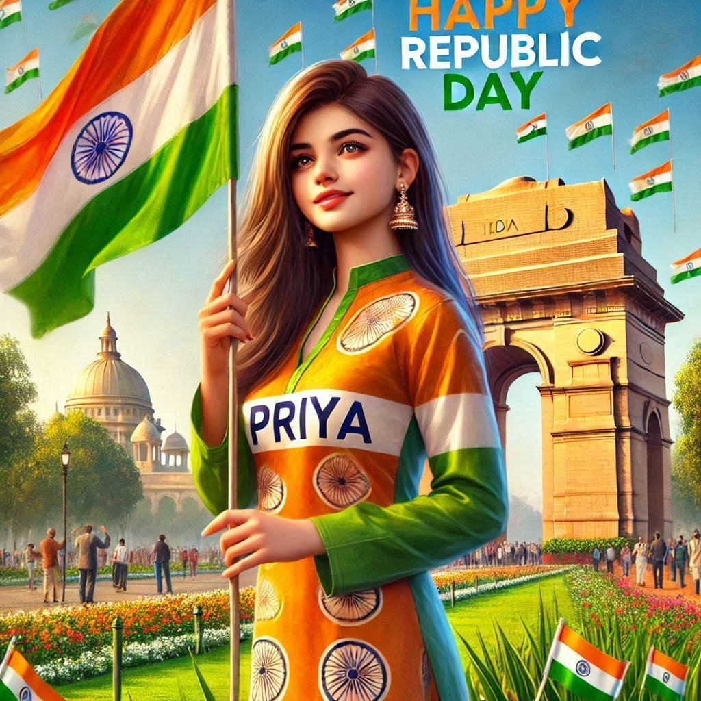 18 year old indian beautiful girl celebrating Republic Day at India Gate, New Delhi. She is wearing a kurti with Priya clearly written on it. she is hoisting the Indian flag proudly with both hands, surrounded by a vibrant, festive atmosphere. The sky is clear with 'Happy Republic Day' written in colorful letters. The scene is realistic with high resolution, showing the grand architecture of India Gate,lush greenery, and people in the background celebrating