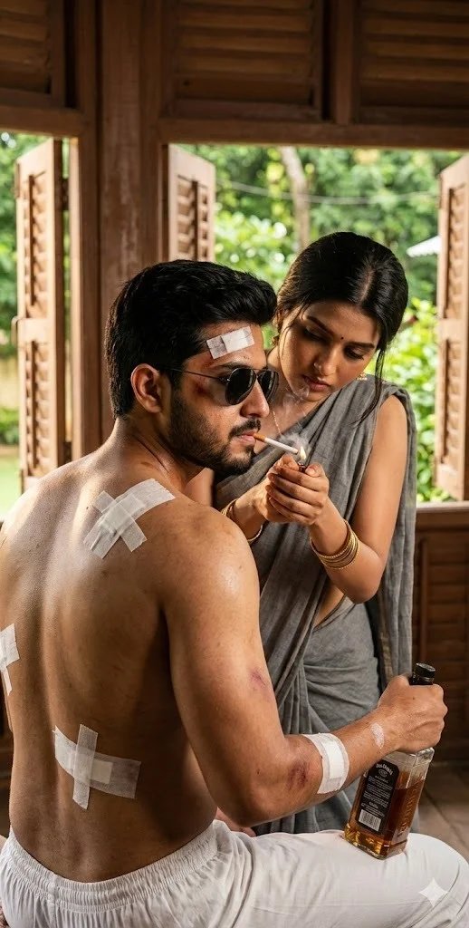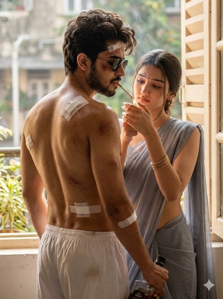 Tne boy nas meaium-iengtn wavy hair, slightly messy and rugged. A small white bandage mark is placed on his forehead. His expression is calm yet intense, eyes lowered with controlled emotion. Behind him stands a young Indian woman (reference- uploaded photo), close and intimate, wearing a soft grey sleeveless sari, minimal makeup, tied hair, and gold bangles. She is gently lighting a cigarette near the boy's lips using a lighter, her face calm, focused, and emotionally connected. The scene is set inside a wooden room with open window shutters, allowing natural daylight to enter. Outside the window, green plants and soft urban background are visible. Warm sunlight highlights Color grading is warm, cinematic, dramatic, with high contrast and ultra-sharp focus. Depth of field is shallow, background softly blurred. Skin texture, sweat, fabric fibers, smoke, and light reflections are extremely realistic.