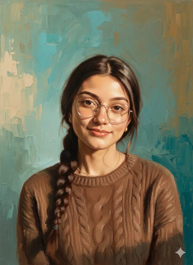 Heavily textured oil painting on canvas, with soft diffused lighting and a bright atmosphere. Background painted with loose, visible impasto brushstrokes in blended teal, sky-blue, olive, warm beige, and soft ochre tones, creating creamy smooth gradient with painterly texture. Portrait of the person from the uploaded photo (100% facial structure match), depicted in a classical Indian fine-art style. Rich, saturated colors with warm undertones. Strong emphasis expressive eyes, soft facial shadows, and realistic skin glow. on Hair painted with layered brushstrokes in deep brown, auburn, and warm highlights, showing volume and subtle texture. Clothing color should remain same. Overall style inspired by modern Indian oil portraiture with bold brushwork, smooth blending around the face, and textured impasto strokes around the background and clothing. Ultra-sharp facial detailing with artistic painterly finish throughout." Do not change the pose or positon and also do not change any facial expressionsCopy to Clipboard