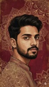 Vertical artistic portrait using the uploaded image as a hard identity lock. Preserve accurate face: facial structure, skin color, eye shape, eyebrows, nose, lips, hairline, hair texture, beard/stubble if present. No beautification. No face changed. Vertical frame 9:16. Medium close-up close-up. The subject was turned slightly sideways, the head slowly turned back towards the camera, felt over the shoulder. The eyes are looking directly at the viewer with a calm, collected gaze. Expression neutral to gentle. Natural manly posture. The foreground subject is clearly defined. The skin is rendered in a graphically illustrated style, not photorealistic. Visible brush strokes, fine linework, soft textures. Maintain realistic facial scale to suit the male face. Hair unchanged from uploaded image, soft textured, naturally flowing. Simple and traditional colored clothes, mixed with artwork (no modern logo). Background: Deep maroon and scarlet red, textile-inspired surface with intricate hand-drawn mandala and lotus motifs, Indian miniature/folk mural style. aged parchment texture,